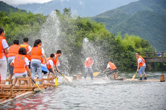 竹排竞渡环节,将本次团建活动推向了第一个高潮。在碧波荡漾的丹霞湖面,有的只是我们每一个团队的龙船,只有同舟共济、共同奋斗,才能到达彼岸。