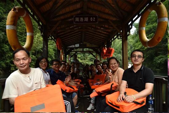 最后,大家一起游览周洛大峡谷,在陡坡处相互搀扶,在疲惫时相互鼓励,合影瀑布下,泛舟情人湖,在这个平均每立方负氧离子含量达10万个的地方放松身心,欣赏美景!